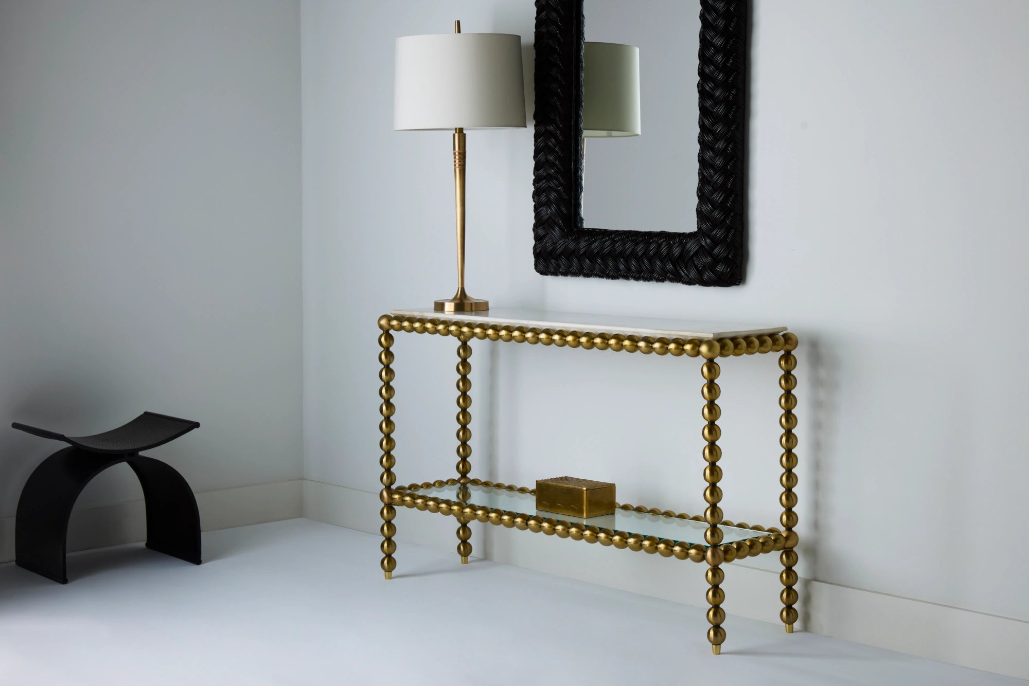 With a slender, tapered brass stem rising elegantly from a solid round base, our Delicate Balance Lamp balances delicacy with impact. Near the top, subtle inlaid bandings of walnut introduce an artisanal touch, enhancing its refined silhouette and adding warmth to its modern design. This lamp serves as a sophisticated accent for any space.